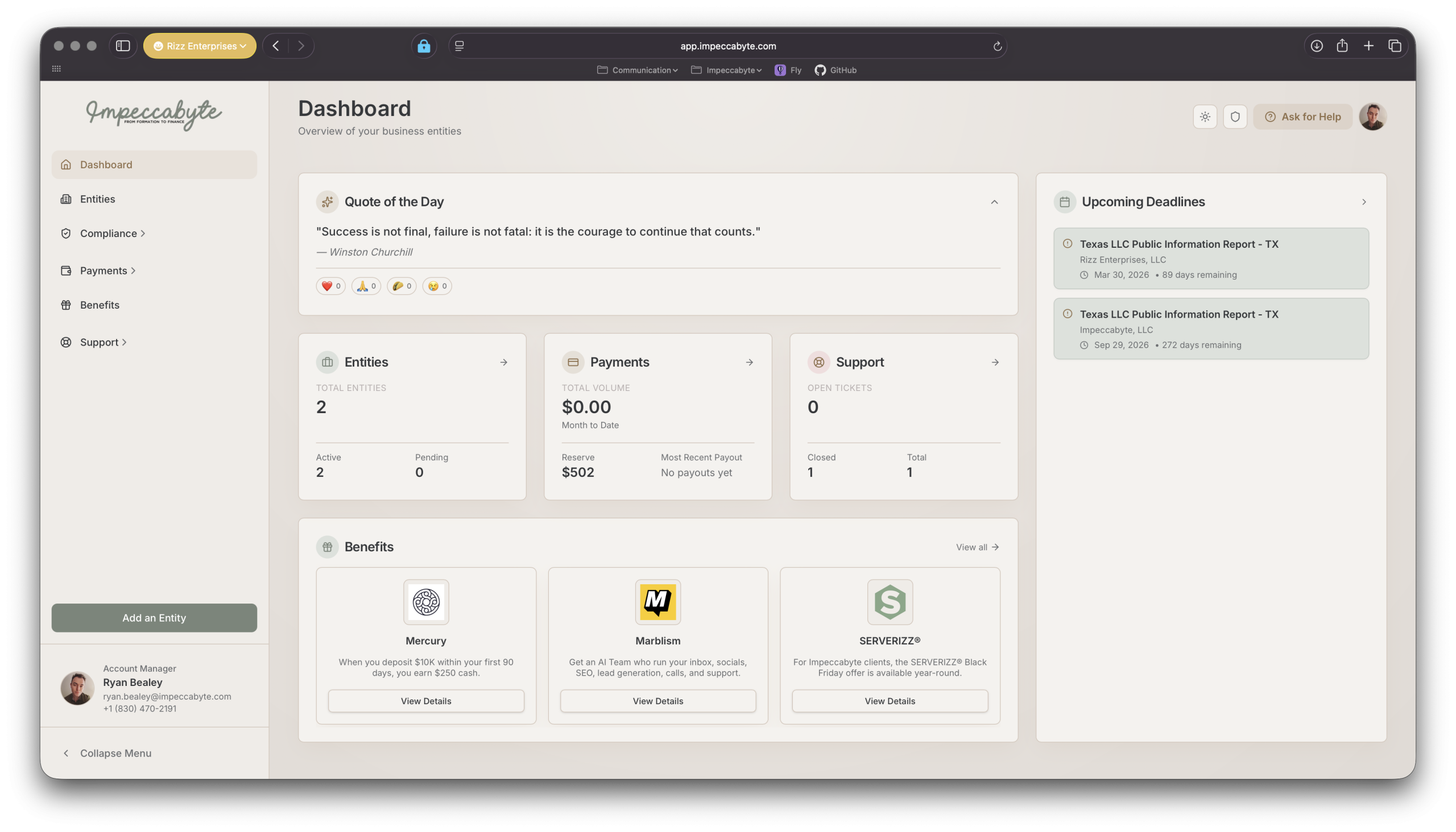 Launch or transform your business operations with a unified dashboard that puts everything at your fingertips. Get real-time insights into your entities, payments, compliance deadlines, and more—all from one intuitive interface.
